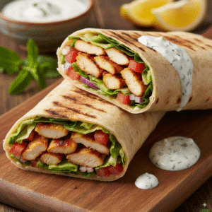 1. Marinate the Chicken: In a bowl, mix yogurt, lemon juice, olive oil, garlic, and spices. Add chicken cubes and mix well. Cover and refrigerate for at least 2 hours, preferably overnight. 2. Cook the Chicken: Preheat a grill or pan over medium-high heat. Cook the marinated chicken for 5-7 minutes per side until fully cooked and golden brown. If using an oven, bake at 400°F (200°C) for 20 minutes. Let the chicken rest before slicing. 3. Prepare the Garlic Sauce: Mix mayonnaise, yogurt, lemon juice, minced garlic, and salt until smooth. 4. Assemble the Wrap: Warm the pita bread, spread a generous amount of garlic sauce, then layer with grilled chicken, lettuce, tomatoes, cucumbers, and pickles. Roll tightly into a wrap. 5. Serve: Cut in half and enjoy with extra garlic sauce or a side of fries.